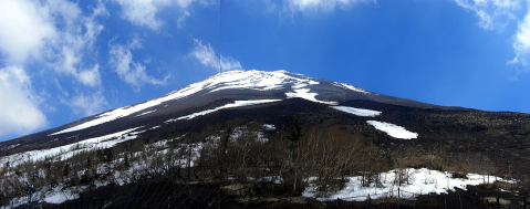 世界遺産に登録された春の富士山 (五合目から撮りました。二枚をパノラマ加工です)